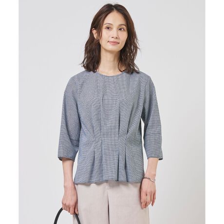 ■デザイン春の装いに軽やかさを与える、上品なミニチェック柄のプルオーバーブラウス。前ウエストに施したタックデザインが立体的なアクセントになった、きれいめな印象の1着。後ろウエストにはゴムを入れることで、程よく体にフィットしたきれいなシルエットを叶えます。裏地のない1枚仕立てのため、汗ばむ季節でもさらりと快適で、空気を含んだような軽やかな着心地が魅力です。ジャケットのインナーとして合わせれば、オフィスに馴染む通勤スタイルに。休日はデニムやワイドパンツと合わせて、リラックス感のある大人のカジュアルスタイルにと、オンオフ問わず幅広く活躍します。