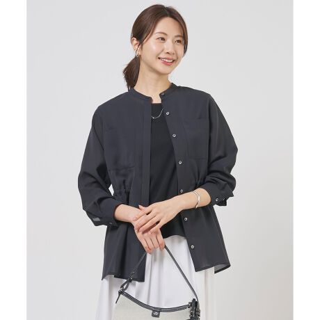 ■デザインノーカラーですっきりと仕上げ、フロントポケットでアクセントを加えたシアーブラウス。手首がのぞく短めの袖丈が、大人の女性らしい抜け感を演出します。ウエストの内側にドロストコードを施しており、きゅっと絞ってメリハリのあるシルエットにしたり、緩めてリラックス感を出したりと、気分に合わせて調整いただけます。釦を開ければ軽い羽織りとしても着用でき、季節の変わり目や冷房対策にも重宝する優秀な1枚です。カラーは、肌なじみが良く洗練された印象のサンドベージュ(#033)、落ち着きのある大人カジュアルな印象のカーキ(#054)、品よく引き締まるネイビー(#075)の3色展開です。