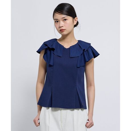 肩から胸元にかけて施されたフリルデザインが印象的な、上品で女性らしいカットソー。甘くなりがちなフリルを、落ち着いたカラーと程よいVネックの計算された分量感にすることで、大人の女性にも取り入れやすい洗練された一枚に仕上げました。フリルは肩周りをやさしく包み込み、二の腕をさりげなくカバーしながら、顔まわりを華やかに演出します。