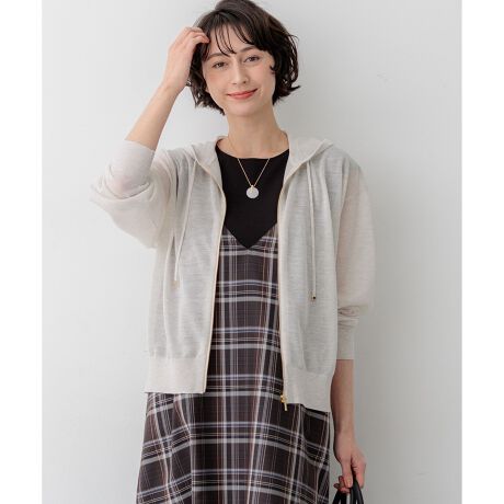 程よい透け感を持つ天竺編みで仕立てた、大人のためのニットパーカーです。スポーティーになりがちなパーカーデザインですが、繊細なシアー素材とファスナー部分にあしらったゴールドのパーツが、女性らしく上品な印象を与えます。裾や袖口のリブを締め付けすぎず、自然にすとんと落ちるシルエットにこだわり、程よいゆとりを持って着られるリラックス感のある一枚に仕上げました。 Tシャツやタンクトップの上にさらりと羽織るのはもちろん、ワンピースと合わせたフェミニンカジュアルなスタイリングもおすすめ。日除けや冷房対策として、季節の変わり目から真夏まで長く活躍します。 カラーは、清涼感あふれるホワイト(#001)、柔らかなニュアンスのアイボリー(#003)、シックで万能なブラック(#005)、肌なじみの良い上品なベージュ(#033)、爽やかなアクセントとなるスカイブルー(#072)、知的な印象のネイビー(#075)の豊富な6色展開です。