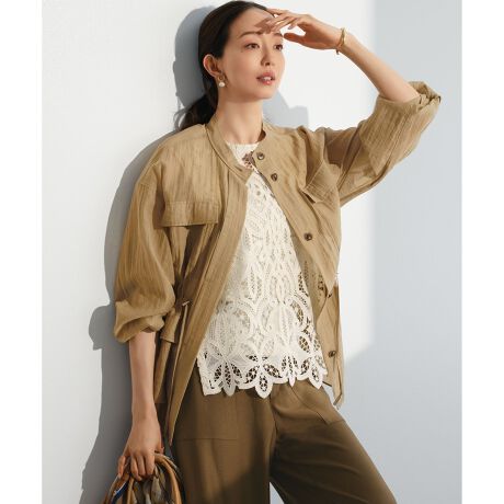 シャツのようにさらりと羽織れる、透け感が涼やかな大人のミリタリージャケットです。身体のラインを拾いにくい程よいオーバーサイズシルエットで、リラックス感のある着こなしを叶えます。大きめのアウトポケットやウエストのドローコードなど、ミリタリーなディテールを取り入れつつも、シアーな素材感で女性らしく上品な印象に仕上げました。 ウエストのドローコードを絞ることでシルエットに変化をつけられるため、ボトムスに合わせたバランス調整も可能です。ワンピースやきれいめなボトムスと合わせたカジュアルミックスなスタイリングはもちろん、Tシャツの上にラフに羽織るだけでも様になります。季節の変わり目のライトアウターとして、幅広いシーンで活躍する一着です。 カラーは、シックで引き締まるブラック(#005)、女性らしく柔らかなベージュ(#033)、こなれた印象を与えるカーキ(#054)の3色展開です。