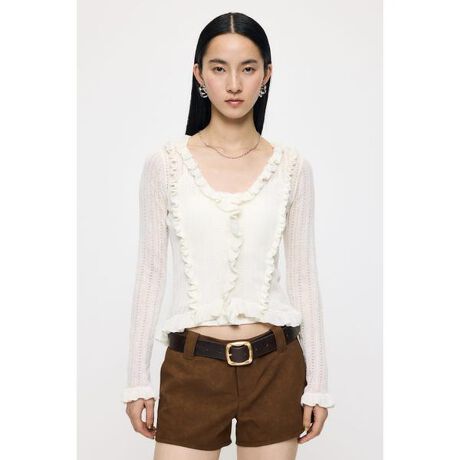 【POINTELLE RUFFLE CD & CAMI/ポインテールラッフルカーディガン アンド キャミソール】■ポイントポインテールのニット編み地が可憐な印象を与える、カーディガンとキャミソールのセット。カーディガンにはラッフルのデザインをあしらい、動くたびに揺れるディテールが華やかさを添えます。セットで着るだけで完成度の高いスタイルに。■ディテール軽やかで春らしいニット素材を使用し、柔らかな着心地を実現。繊細な透かし柄が程よい抜け感を演出します。キャミソールはストラップのデザインがポイントとなり、レイヤード時にもさりげないアクセントに。■スタイリングデニムでカジュアルに、今期はミニボトムの合わせも新鮮です。ワンピースの上に羽織ったレイヤードスタイルもおすすめです。