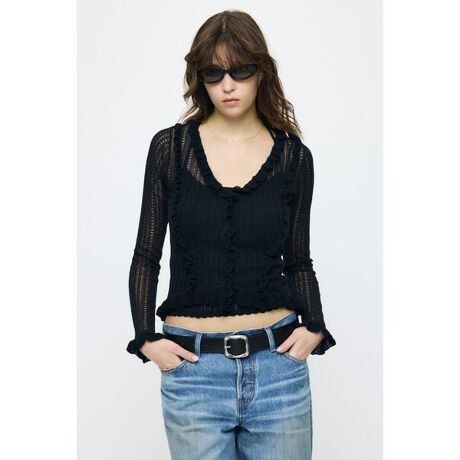 【POINTELLE RUFFLE CD & CAMI/ポインテールラッフルカーディガン アンド キャミソール】■ポイントポインテールのニット編み地が可憐な印象を与える、カーディガンとキャミソールのセット。カーディガンにはラッフルのデザインをあしらい、動くたびに揺れるディテールが華やかさを添えます。セットで着るだけで完成度の高いスタイルに。■ディテール軽やかで春らしいニット素材を使用し、柔らかな着心地を実現。繊細な透かし柄が程よい抜け感を演出します。キャミソールはストラップのデザインがポイントとなり、レイヤード時にもさりげないアクセントに。■スタイリングデニムでカジュアルに、今期はミニボトムの合わせも新鮮です。ワンピースの上に羽織ったレイヤードスタイルもおすすめです。