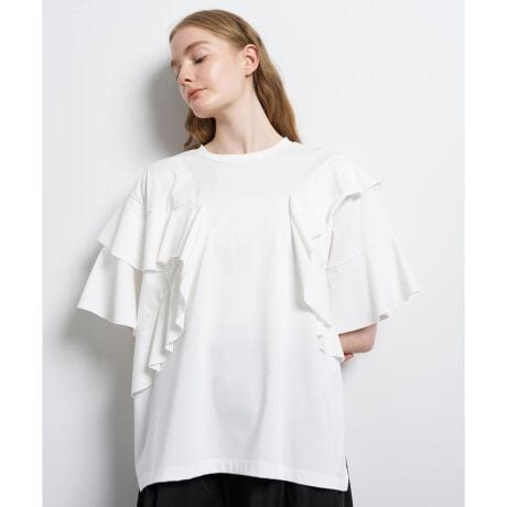 遊び心あるアシンメトリーなフリルが目を惹くトップス。