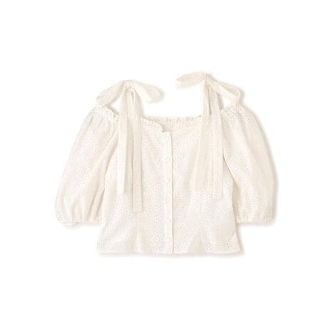 コットンにカットワーク刺しゅうをあしらった華やかなビスチェ風ブラウス。肩まわりはゴムが入っているのでオフショルダーとしても着られます。肩リボンは長さ調整可能。背中はシャーリング仕様でフィット、袖は二の腕をふんわりカバーする袖丈です。裾はインもアウトも楽しめるすっきりとした丈感です。※撮影時照明の関係により、色味が違って見える場合がございます。またパソコン・スマートフォンなどの環境により、若干製品と画像のカラーが異なる場合もございます。予めご了承ください。商品の色味は、商品単品画像をご参照下さい。※商品画像はサンプルのため、色味やサイズ等の仕様に変更がある場合がございますので、予めご了承ください。