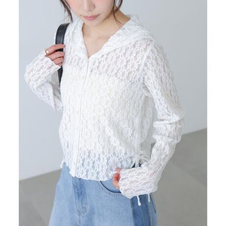 繊細なカットレース素材を使用した軽やかなフーディー。フロントはボタン開き仕様で、トップスとしても羽織としても着回せます。サイドのドロストでシルエットに変化をつけられ、ウエストラインをすっきり見せながらスタイルアップ効果も期待。コンパクトな丈感でバランスが取りやすく、デニムでカジュアルに、ワンピースやスカートと合わせてレディライクにも楽しめます。※モデルの着用画像の場合、光の当たり具合により、実際の色味と異なって見えることがございます。色味は、商品単体の画像をご参照ください。