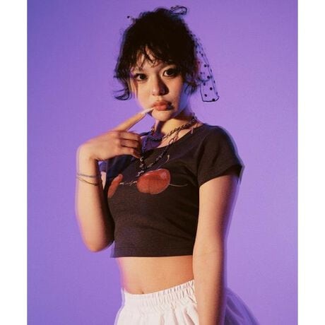 バストラインに沿うように配置されたチェリープリントが視線を惹きつける、アイキャッチなクロップドT。