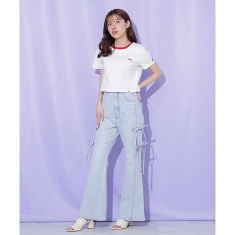 高いストレッチ性で細身ながら動きやすいフレアデニムパンツ。前後の脇切り替えとサイドリボンが気になる部分をカバーし、脚をすっきりと見せてくれます。ヒップラインもキレイに見えるシルエットに拘ったデザインです。ハイウエストで、JILL by JILL STUARTでご用意しているショート丈トップスとも相性抜群。釦とレザーパッチはオリジナルロゴ入りです。※撮影時照明の関係により、色味が違って見える場合がございます。またパソコン・スマートフォンなどの環境により、若干製品と画像のカラーが異なる場合もございます。予めご了承ください。商品の色味は、商品単品画像をご参照下さい。※商品画像はサンプルのため、色味やサイズ等の仕様に変更がある場合がございますので、予めご了承ください。