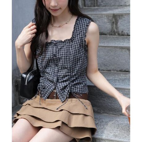 デコルテが綺麗にスッキリ見えるスクエアネックに、フロントのドロストギャザーで表情をつけたブラウス。リボンを結んだり垂らしたり、ギャザーの寄せ具合で着丈を変えて着こなせます。襟まわりと袖口には共地ミニフリルをあしらいポイントをプラス。後ろは一部シャーリングギャザーが入っているので、体に程よくフィットします。ワイドデニムやカジュアルなボトムス合わせがおススメ。清涼感のあるコットン素材なので、ラフでカジュアルな印象です。※モデルの着用画像の場合、光の当たり具合により、実際の色味と異なって見えることがございます。色味は、商品単体の画像をご参照ください。