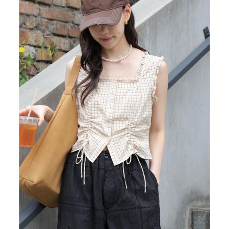 デコルテが綺麗にスッキリ見えるスクエアネックに、フロントのドロストギャザーで表情をつけたブラウス。リボンを結んだり垂らしたり、ギャザーの寄せ具合で着丈を変えて着こなせます。襟まわりと袖口には共地ミニフリルをあしらいポイントをプラス。後ろは一部シャーリングギャザーが入っているので、体に程よくフィットします。ワイドデニムやカジュアルなボトムス合わせがおススメ。清涼感のあるコットン素材なので、ラフでカジュアルな印象です。※モデルの着用画像の場合、光の当たり具合により、実際の色味と異なって見えることがございます。色味は、商品単体の画像をご参照ください。
