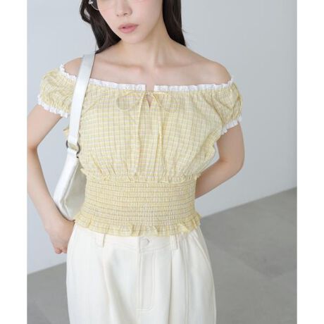 水洗いでナチュラルな風合いと柔らかさを出したチェック柄ブラウス。コンパクトなサイズ感で、バスト下の太めシャーリングゴムがバストラインを程よく強調します。襟ぐりのレースがアクセントになり、内蔵ゴムでオフショルダーとしても着られる2way仕様。キャップスリーブの小さめパフスリーブで可憐な印象をプラス。デニムやスウェットパンツを合わせると、抜け感のあるスタイリングが楽しめます。※モデルの着用画像の場合、光の当たり具合により、実際の色味と異なって見えることがございます。色味は、商品単体の画像をご参照ください。