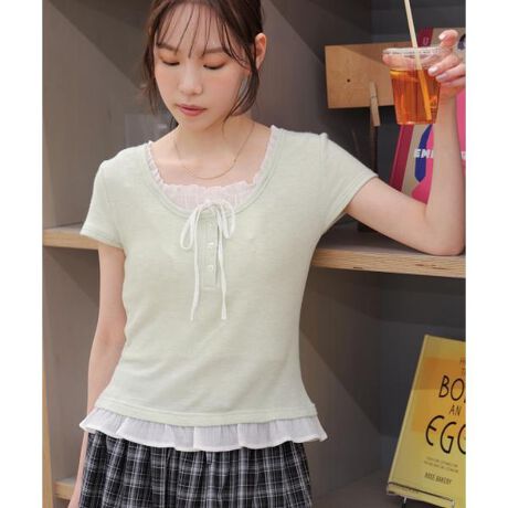 フェイクレイヤードフリルリボンフレンチスリーブカットソー