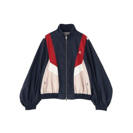 ワイドシルエットのショート丈で、様々なアイテムとのバランスを楽しめるトラックジャケット。ボリュームのある袖口が特徴的で、左胸には〈RHODOLIRION〉のアイコンであるツバメの刺繍をあしらいました。素材にはワッシャー加工を施したナイロン100%を使用。今季は2カラーのブロッキングに、パイピングラインでアクセントを加えています。80’sムード漂うナイロン特有の鈍い光沢感が、マイルドな輝きを放ち、スポーティかつ軽快な印象に。同素材のバルーンパンツやショーツとのセットアップスタイルもおすすめです。