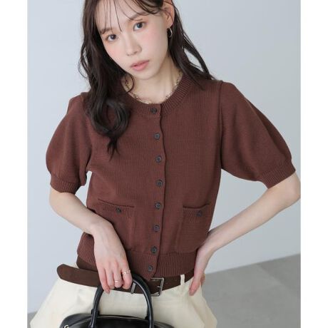 昨年ご好評いただいたカーディガンが、ディテールをアップデートして今年も登場!ボタンなど細部を見直し、コンパクトなサイズ感でよりスッキリとした印象に仕上げました。小粒ボタンとフロントのミニポケットがポイントの半袖デザイン。カラッとした糸で肌触りがよく、しっかりとした編地で型崩れしにくいです。袖のふんわりとしたフォルムもポイント。表面感のある編地で体のラインを拾いにくく、幅広いコーディネートに活躍。カーディガンとしてはもちろん、ボタンを留めてトップスとしても着回せます。デニムパンツ、ボリュームのあるボトムス合わせもおすすめです。※モデルの着用画像の場合、光の当たり具合により、実際の色味と異なって見えることがございます。色味は、商品単体の画像をご参照ください。