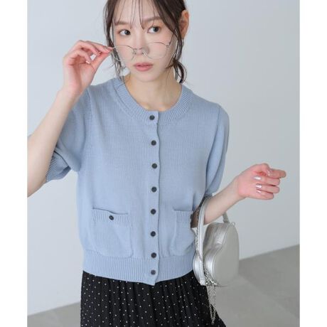 昨年ご好評いただいたカーディガンが、ディテールをアップデートして今年も登場!ボタンなど細部を見直し、コンパクトなサイズ感でよりスッキリとした印象に仕上げました。小粒ボタンとフロントのミニポケットがポイントの半袖デザイン。カラッとした糸で肌触りがよく、しっかりとした編地で型崩れしにくいです。袖のふんわりとしたフォルムもポイント。表面感のある編地で体のラインを拾いにくく、幅広いコーディネートに活躍。カーディガンとしてはもちろん、ボタンを留めてトップスとしても着回せます。デニムパンツ、ボリュームのあるボトムス合わせもおすすめです。※モデルの着用画像の場合、光の当たり具合により、実際の色味と異なって見えることがございます。色味は、商品単体の画像をご参照ください。