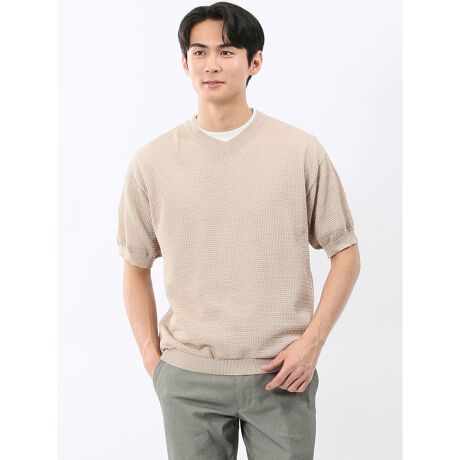 Vネックの半袖プルオーバーはポリエステルのニット素材(12ゲージ)です。涼しげな透かし編み、サラッとした風合い、軽い着心地が特徴。インナーの半袖Tシャツは白無地の天竺編みカットソーです。