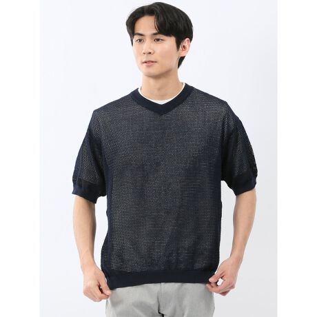Vネックの半袖プルオーバーはポリエステルのニット素材(12ゲージ)です。涼しげな透かし編み、サラッとした風合い、軽い着心地が特徴。インナーの半袖Tシャツは白無地の天竺編みカットソーです。