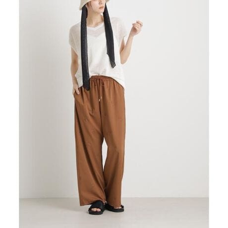オリジナルの刺繍柄がさりげなく洒落見えするイージーワイドパンツ。とろんとした落ち感のある女性らしい柄アイテムなので、カジュアルなトップスと合わせた際もきれいめな印象に仕上がります。