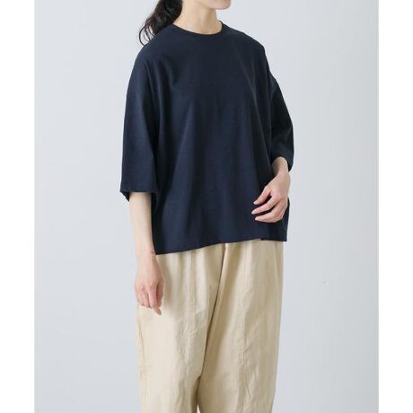 大人のカジュアルスタイルに馴染むトップスをご紹介します。強撚糸を引き揃えて編み立てた天竺生地を使用。絶妙な立体感と独特な風合いが特徴です。身幅を広く取ったワイドシルエットはリラックス感のある着心地。肘までしっかりと隠れる袖もポイントです。パンツやスカートに合わせるだけで、薄着の季節もどこか抜けた雰囲気の装いに。