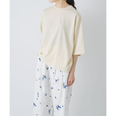 大人のカジュアルスタイルに馴染むトップスをご紹介します。強撚糸を引き揃えて編み立てた天竺生地を使用。絶妙な立体感と独特な風合いが特徴です。身幅を広く取ったワイドシルエットはリラックス感のある着心地。肘までしっかりと隠れる袖もポイントです。パンツやスカートに合わせるだけで、薄着の季節もどこか抜けた雰囲気の装いに。