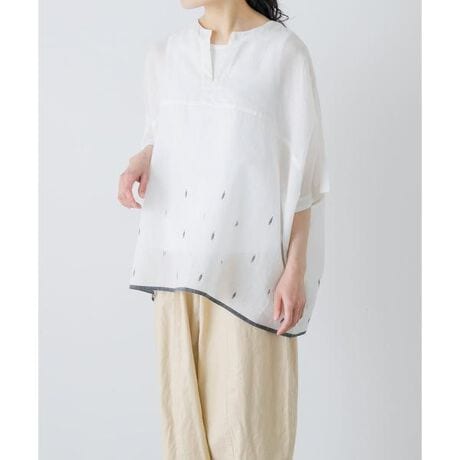 こだわりのジャムダニ織を用いたシリーズ。細い糸を丁寧に織り上げ、柄が表現されています。繊細かつ軽やかで涼しい着心地は、半袖の季節に長く寄り添います。無地の面積が多く、裾の方に柄が入っている程よい存在感。セルビッチを活かした裾のラインもポイントになっています。身幅たっぷりのワイドシルエットは、風通しが良く夏場も快適に。襟ぐりはVになっていて抜け感があり、顔まわりをスッキリと見せてくれます。シンプルながらも着映えるトップス。大人のナチュラルな装いにおすすめです。
