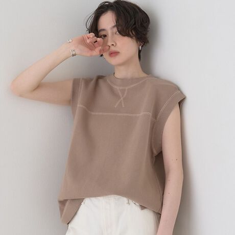 ゆったりとしたボックスシルエットのノースリーブプルオーバー。ネックや裾に施したリブや、フロントのステッチワークがさりげないアクセントになっています。前後差のある着丈とサイドスリットで抜け感を出しつつ、幅広いボトムと合わせやすいバランスに仕上げました。