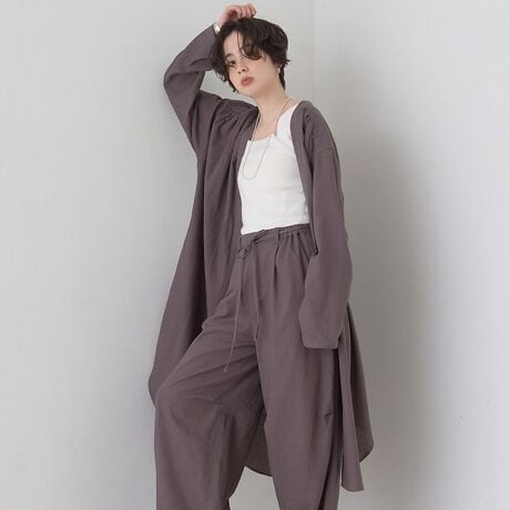 ロング丈の織スタイルで、背面に広くタックを取ることで立体的なシルエットを作り出しています。前は開けて軽く織るだけで抜け感が出る仕様。コートほど重くならず気軽に取り入れられる一着です。同素材のパンツ(品番:31520050002)と合わせたセットアップもおすすめです。