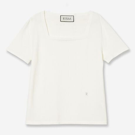 女性らしいスクエアネックで、1枚はもちろんジャケットや織りのインナーとしても活躍します。