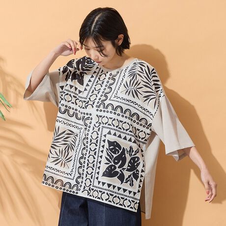 前身頃に、モンテスラをイメージした大胆なボタニカルのパネルプリント生地を使用した、プルオーバータイプのブラウス。