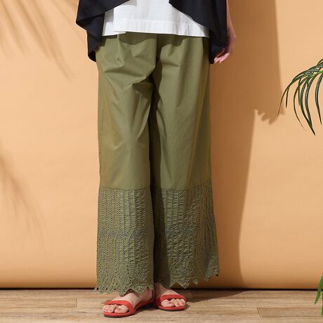■膝下の幾何柄カットワーク刺繍&ワイドなシルエットが今っぽいイージーパンツ■