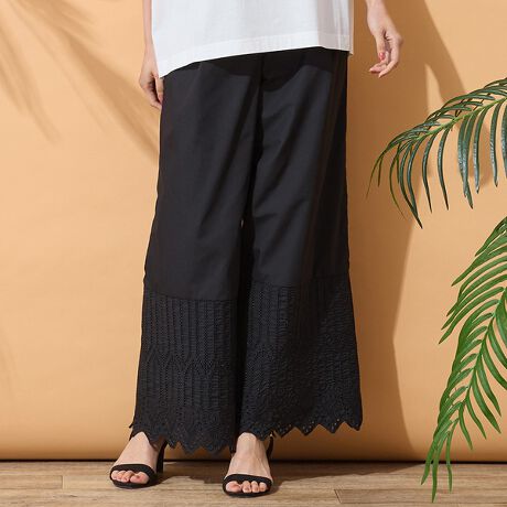 ■膝下の幾何柄カットワーク刺繍&ワイドなシルエットが今っぽいイージーパンツ■