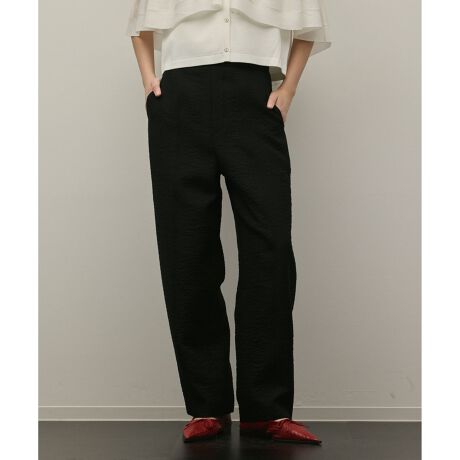 シアー感のある涼やかなジャガード生地でお作りしたテーパードラインのパンツ。ややゆとりのあるテーパードラインでレッグラインを拾わず、大人のニュアンスを感じられる洗練感のあるシルエットに仕上げました。ふんわりと広がる美しいラインが、気になるウエストまわりをさりげなくカバーしてくれるのも嬉しいポイント。一見無地でシンプルですが、素材に表情があるのでどこか目を惹くおしゃれ感のある1本に仕上がっています。お揃いでお作りしたトップスを合わせれば、オフィススタイルやセレモニーシーンなどのセミオケージョンにもぴったりです。