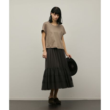 たっぷりチュール生地を使用した、贅沢仕様のティアードスカート。横段にとったタックとギャザーの陰影が美しく、着こなしを優雅に印象つけます。ウエスト周りはすっきりとさせて甘さを抑え、大人っぽく品のあるデザインに。ウエストはゴム仕様にし、楽に穿いていただける1枚に仕上げました。用尺をたっぷりとった華やかな蹴まわしが、歩いたときの優しい揺らぎを叶えます。コーディネートの鮮度を高めてくれる、大人のためのフェミニンスカートです、