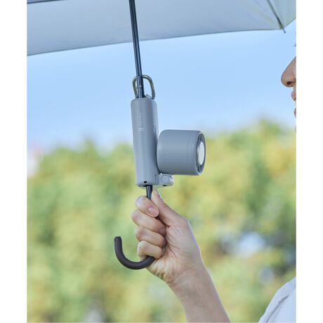 グリップ部の開閉ボタンを押すと本体側面が開き、傘への取り付けが可能。日傘とハンディファンでの両手が塞がるストレスを解消します。装着できる傘の中棒は6mm〜11mmまで対応可能です。