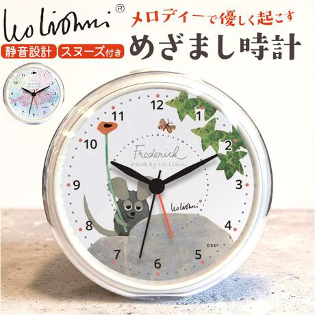 【静かに、かわいく、起こして】絵本の世界観をそのままに、毎朝をやさしく彩るメロディーアラームクロック。【メロディーで優しい目覚め】メロディーと電子音を切替可能で、毎朝をやさしく包むアラームクロック◎【静音設計で快眠サポート】カチカチ音が出ない連続秒針タイプで、夜も昼も音を気にせず快適に過ごせる仕様!【スヌーズで二度寝もご安心】約5分で自動作動するスヌーズ機能を搭載、寝坊しがちな忙しい朝もしっかりサポート〇【青色LEDで夜間も視認抜群】暗い部屋でもさっと時間を確認できる、青色LEDライト照明つきのうれしい仕様♪【絵本キャラのおしゃれな盤面】レオ・レオニの人気キャラクターをあしらった、お部屋をやさしく彩るデザインフェイス。【電池式でどこでも使用可】単3乾電池2本を使用するシンプルな電池式。※乾電池は別売りです。