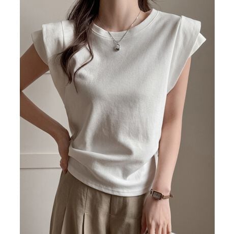 袖口が二枚重ねになったダブルショルダーデザイン。シンプルなTシャツの高見えポイントになります。二の腕カバーと細見えも叶えます。
