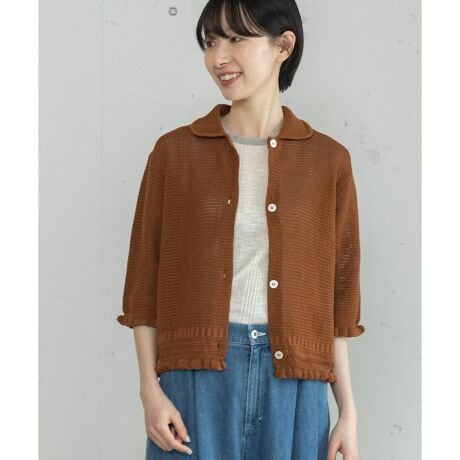 衿つきの鹿の子編みデザインがポロシャツのようなカーディガン。袖口と裾にフリルをあしらいました。ボタンを開けずにプルオーバーとしての着用もオススメです。程よい透け感で清涼感のあるアイテムです。