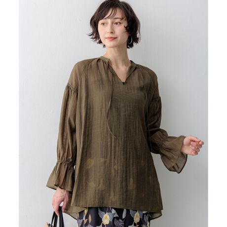ラスティックな表情のシアー素材に、ピンタックやレースなどのフェミニンなディテールを散りばめたデザインブラウス。首元のリボンや胸元の繊細な切り替えが、顔周りを華やかに演出します。ふんわりとしたエアリーなシルエットが体のラインを拾わず、リラックスした着心地と体型カバーを両立。袖口にはゴムギャザーを施しており、そのままでフェミニンなキャンディスリーブとして楽しむのはもちろん、たくし上げて手首を見せれば、よりボリューム感のある袖になり、抜け感のあるスタイリングが完成します。デニムを合わせたカジュアルな着こなしから、テーパードパンツやタイトスカートと合わせたきれいめスタイルまで幅広く活躍。トップスのボリューム感を活かし、ボトムスはすっきりとしたシルエットでまとめるのがおすすめです。カラーは、肌なじみが良く上品なベージュ(#033)、シックで洗練された印象のブラック(#005)、深みのある色合いがこなれ感を演出するカーキ(#054)の3色展開です。