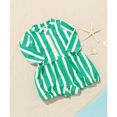 夏らしいグリーンの大きなストライプ柄が目を引くベビー水着。