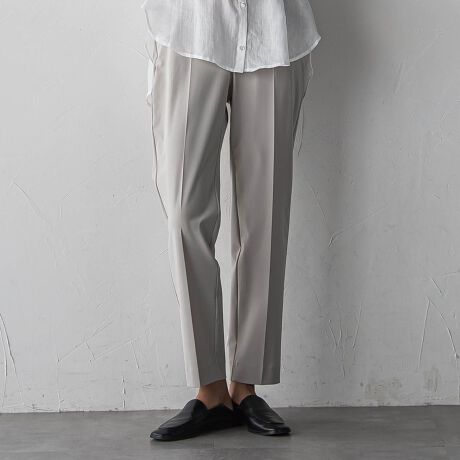 撥水機能を備えたトリコット素材のテーパードパンツ。