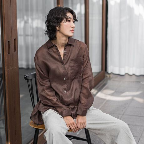 ラミー100%素材になります。ラミーならではの光沢感、ハリ感が特徴で、ラフに着用していただける素材感でありながら上品でキレイ目な印象を与える製品に仕上がっています。