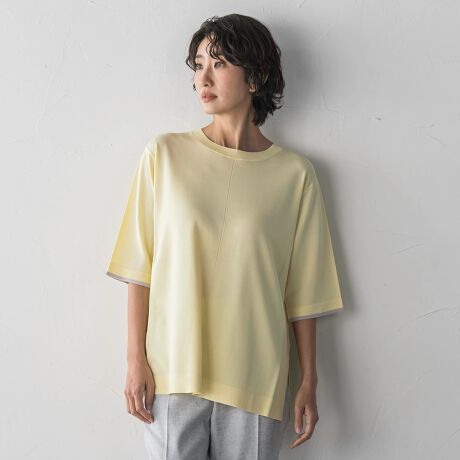 アウターを脱いでも二の腕や肘をさりげなくカバーしつつ品よく見せる大人な5分袖。