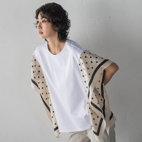 大人かわいいドット柄のスカーフを部分使いしたカットソー。