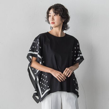 大人かわいいドット柄のスカーフを部分使いしたカットソー。