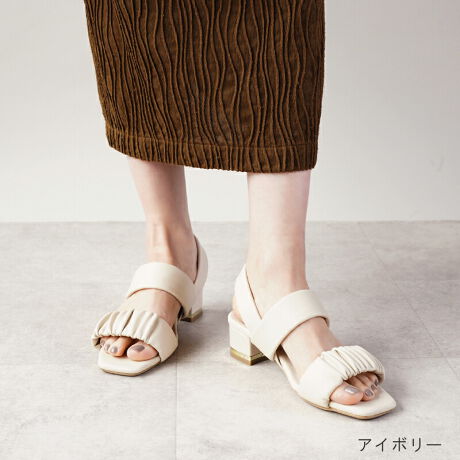 ギャザー入りストラップが足元を華やかに彩り、4cmの太ヒールで安定感も抜群。