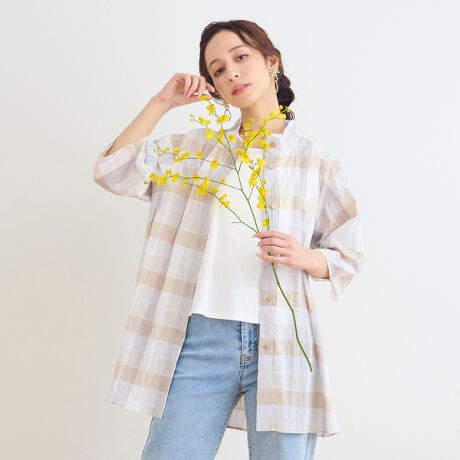 タンクトップやTシャツの上にさらっと織ると軽やかで涼し気な印象。袖は切り替えてあり膨らみ感を持たせたシルエット。風になびく裾がさわやかな印象。