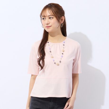 衿ぐりのギャザーをアクセントにしたシンプルなTシャツ。ジャケットやブラウスなどのインナーにおすすめ。また一枚でもかわいらしいアイテム。