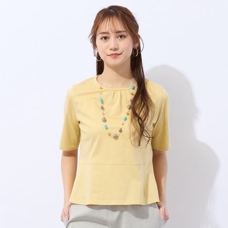 衿ぐりのギャザーをアクセントにしたシンプルなTシャツ。ジャケットやブラウスなどのインナーにおすすめ。また一枚でもかわいらしいアイテム。