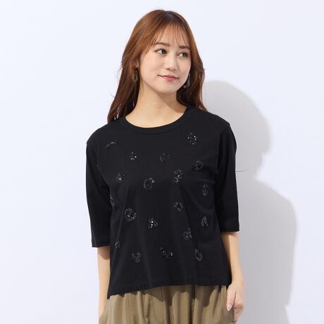 生地と同色のスパンコールを使用しているため、目立ち過ぎずさりげないきらめき感を楽しめるTシャツ。程よくアクセントになりシンプルですが無地Tシャツと差のつく一枚。