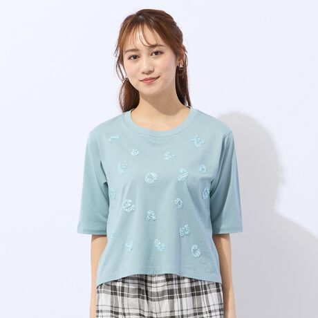 生地と同色のスパンコールを使用しているため、目立ち過ぎずさりげないきらめき感を楽しめるTシャツ。程よくアクセントになりシンプルですが無地Tシャツと差のつく一枚。